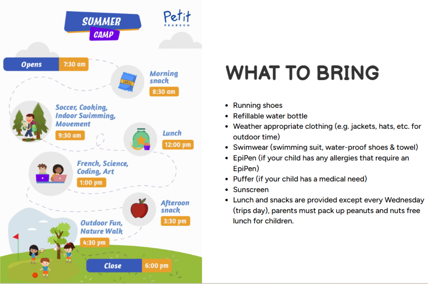 Our camp will run from Mondays to Fridays for children (4 – 12 years old) from 7:30am to 6:00pm. Children will have fun with a multitude of learning experiences from Soccer, French, Cooking, Science, Coding, Indoor Swimming, Art, Movement and Outdoor Nature Walk .